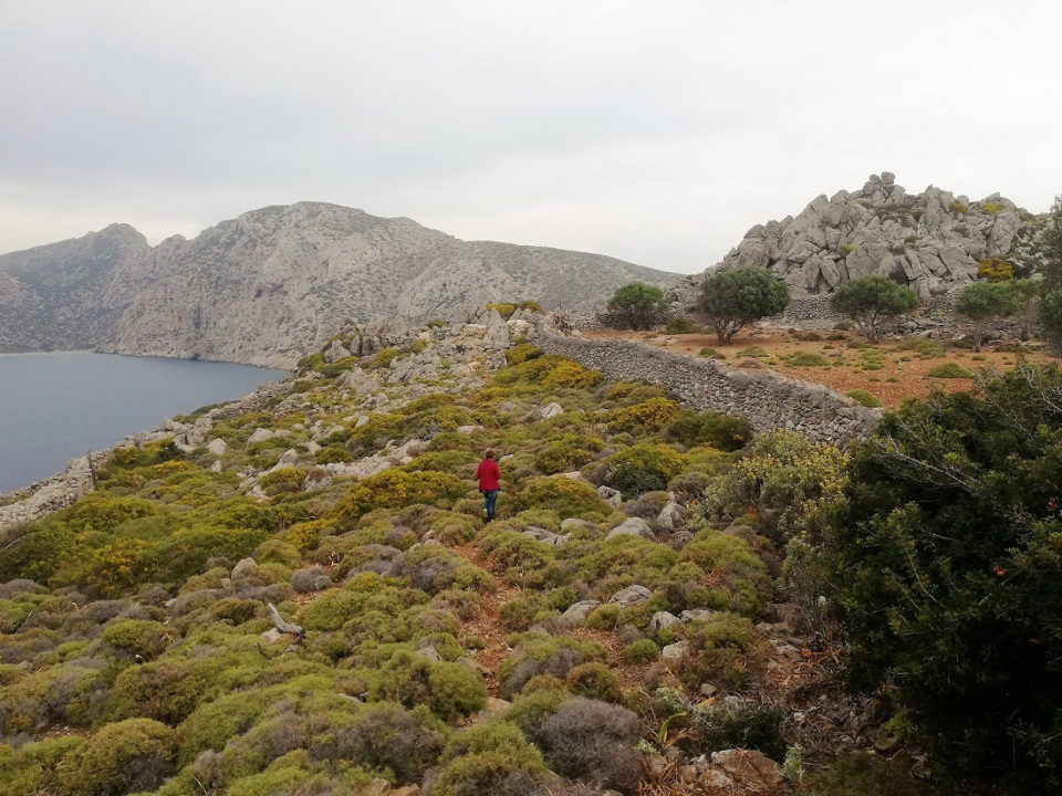 Nous descendons à terre, pour explorer le hameau et ses environs, et nous partons sur un chemin escarpé, serpentant entre les murets de pierres sèches, et les parcelles d'oliviers, livrés maintenant à eux-mêmes.