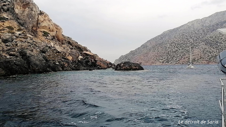 Très beaux points de vue, sur la baie, et sur la côte est. J'en profite pour reconnaitre le détroit que nous franchirons demain, entre Karpathos et la petite île Saria voisine.