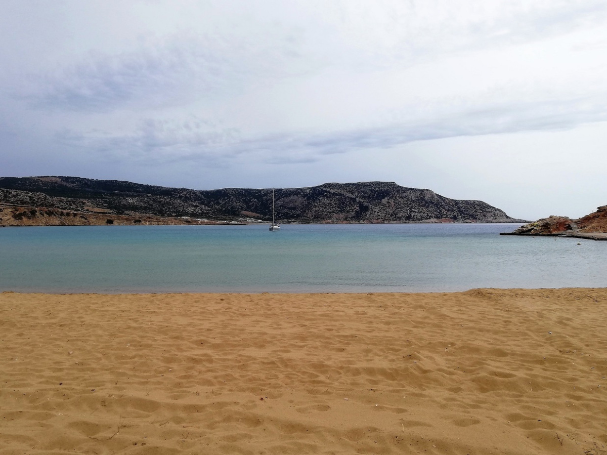 Peu avant 13h, nous mouillons devant la plage d'Amopi , dans Ormos Omorphos. Fond de sable, 5 m d'eau. Nous déroulons 50 m de chaine, en prévision du coup de vent à venir. Descente à terre, marche jusqu'à la ville...