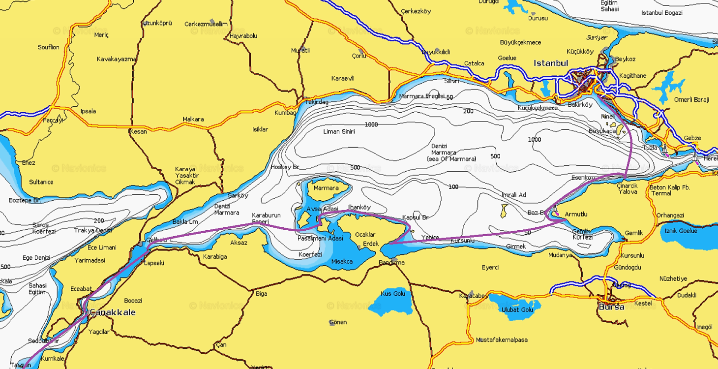 L'ensemble sépare l'Europe, au nord-ouest, de l'Asie, au sud-est. Il y a 150 milles environ entre l'entrée sud des Dardanelles et Istanbul, située sur le Bosphore.