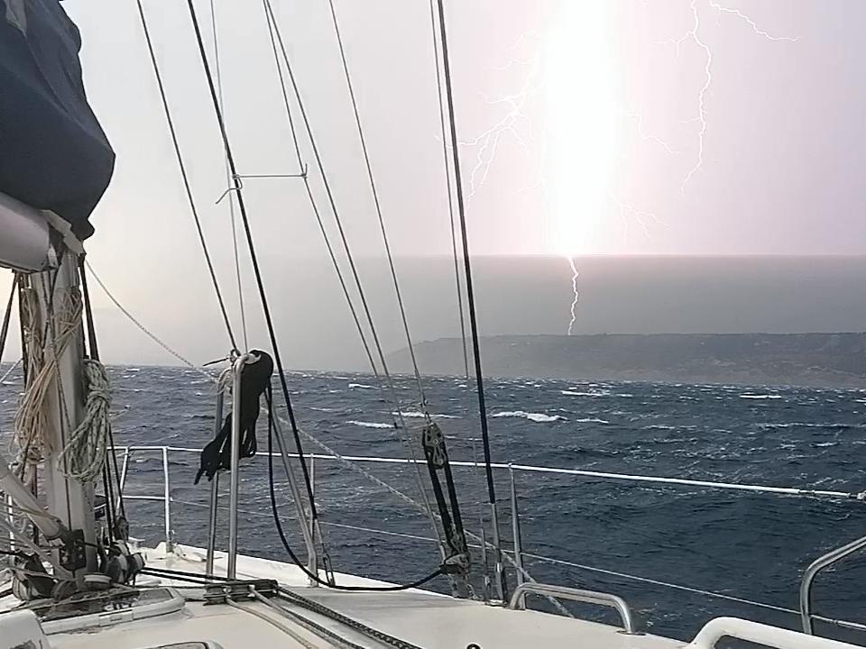 A 13h30, nous y sommes : éclairs, averses de pluie, rafales jusqu'à 30 noeuds, vagues désordonnées... Je suis contraint bientôt de virer pour repartir vers le nord, pour mieux étaler le vent et les vagues.