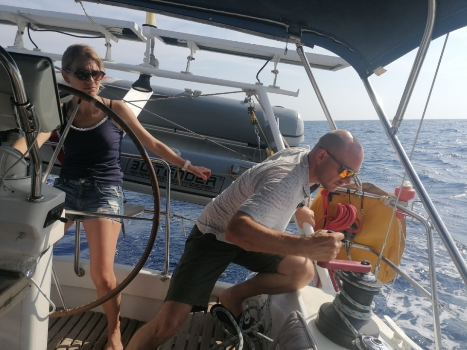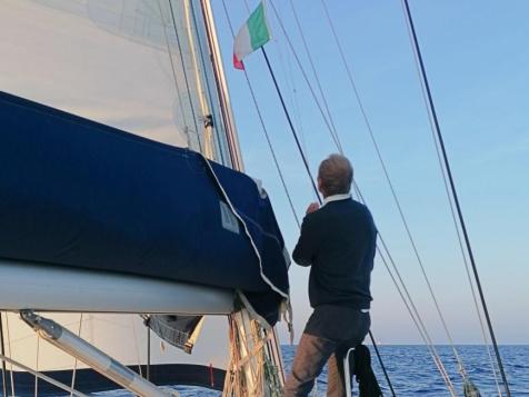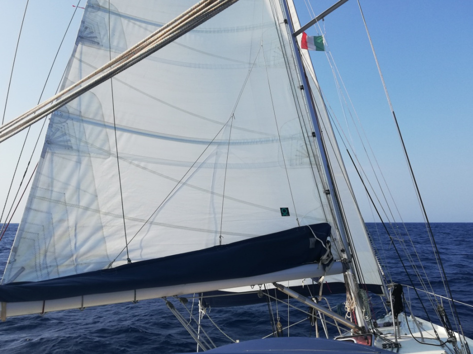 Vers 14h, au milieu du Gofe de Squillace, le vent tombe, et passe progressivement à l'ouest. Bientôt, il forçit, et nous pouvons repartir sous voiles, jusqu'à tombée de nuit.