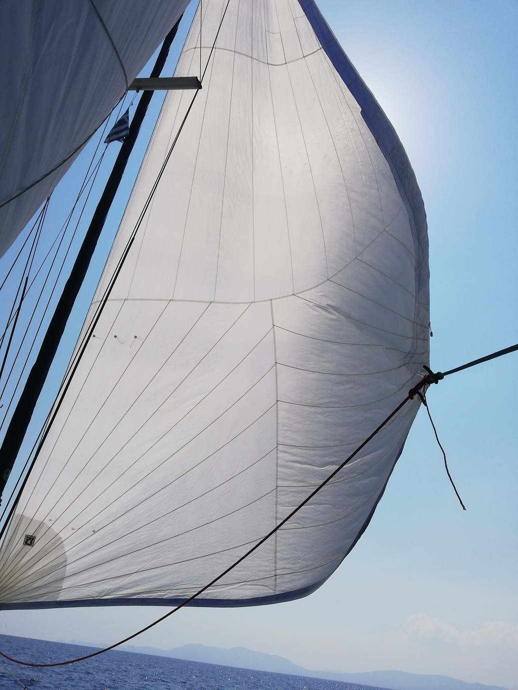 Un vent modéré de sud-est nous fournit l'occasion de tester la nouvelle voile réparée. Essai concluant, puisque nous parvenons à naviguer à 4 nœuds, dans seulement 6 nœuds de vent. Le vent forcit un peu, et nous approchons rapidement de la baie de Lindos, où nous mouillons vers 16h30, sous l'acropole antique.