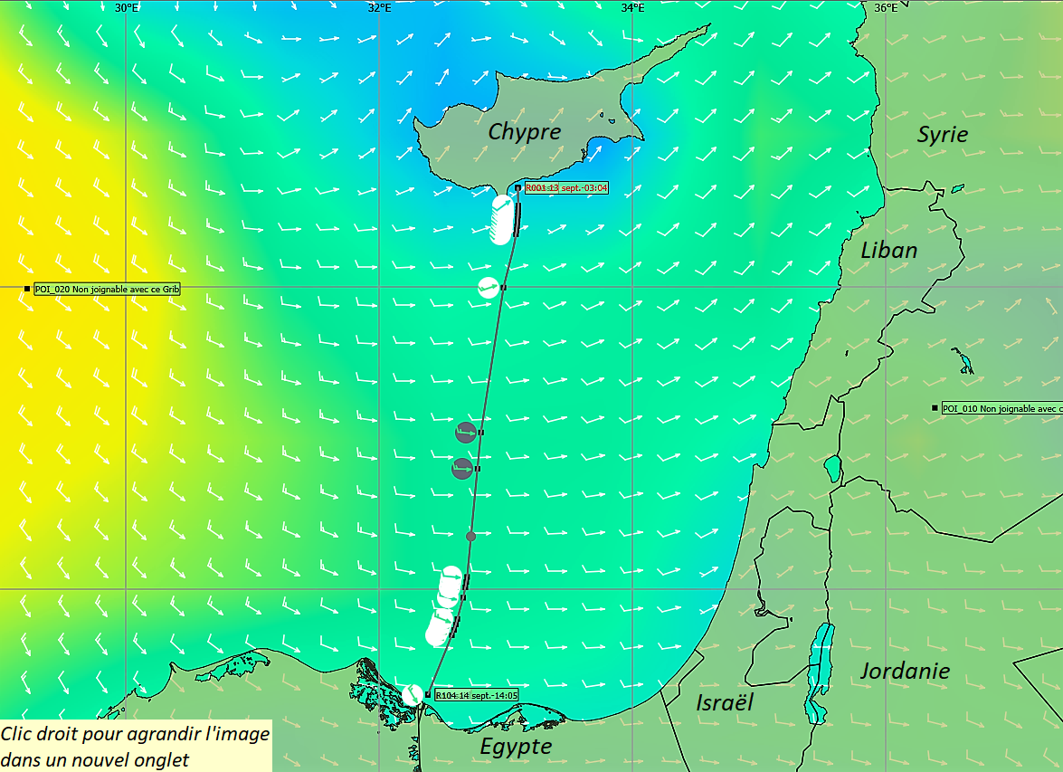 Le résultat du calcul est une traversée prévue en 35 heures, pour un départ du mouillage à 3h UTC (6h en temps local). Ceci nous permettrait, après une seule nuit en mer, d'arriver à Port-Saïd de jour, dans l'après-midi. J'espère même un voyage un peu plus rapide, car, par expérience, je sais que le modèle américain GFS (Global Forecast System) que j'ai utilisé, sous-évalue les vents modérés que nous devrions rencontrer...
