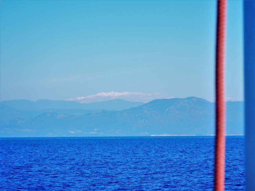 Après une nuit paisible, où nous prenons tour à tour nos quarts, nous sommes au petit matin en vue des sommets neigeux de la chaine turque du Taurus. Nous nous rapprochons encore des côtes, vers notre destination, l’ile grecque de Kastellorizo. A 13h, nous sommes amarrés dans son port principal, Megisthi.