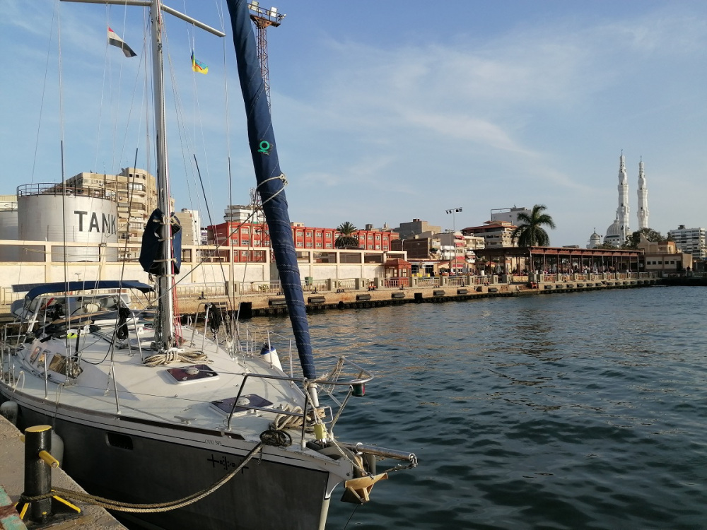19 Avril : Dans un véhicule envoyé par Mohamed Mohsen (notre contact du Suez Canal Authority), nous parvenons à Ismaïlia peu avant midi. La route a été sans histoire, simplement marquée par un arrêt pour des courses d'avitaillement, qui nous a permis de remplir le coffre de la voiture. Nous découvrons Tahenkat, autour duquel s'affaire déjà une équipe de plongeurs. Ceux-ci vont commencer à nettoyer la carène (essentiellement gratter les coquillages qui y sont fixés), pendant que nous effectuons les formalités : douane et police, et paiement de la fameuse taxe de sortie-entrée dans la zone du canal (4000 livres égyptiennes, soit environ 120 €).