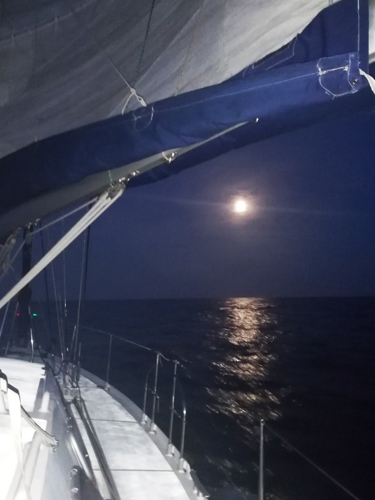 Au coucher du soleil, il se relève du sud-ouest, et nous repartons sous voilure réduite, travers tribord amures. Nous profitons de cette navigation agréable pendant les quarts de nuit. La vitesse se maintient entre 5 et 6 nœuds jusqu'au petit jour.