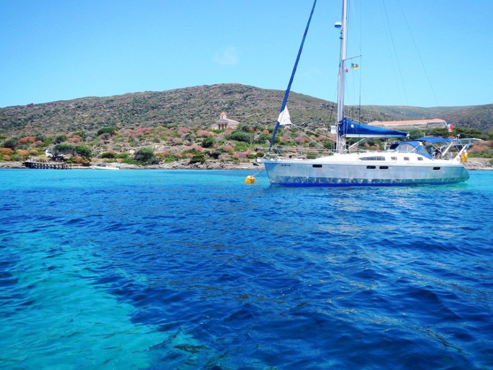 Nous mouillons sur bouée, à l'entrée du golfe, dans une zone protégée située à l'abri du Capo San Marco.