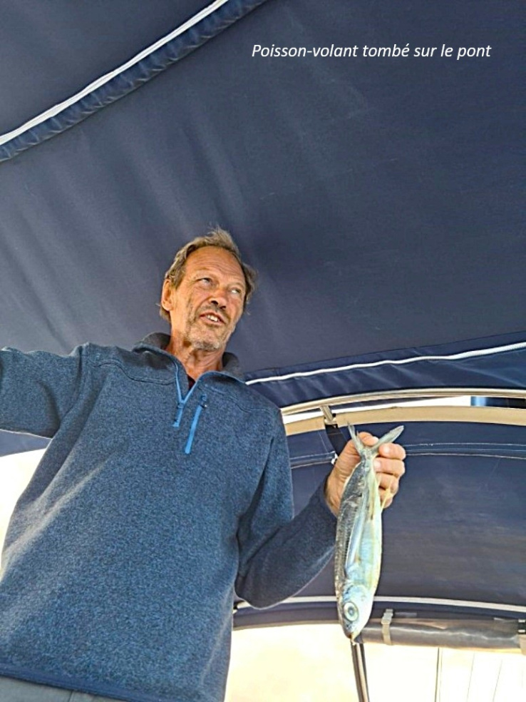 Nous dérangeons de nombreux bancs de poissons-volants, provoquant des envols simultanés spectaculaires, et admirant les vols parfois très prolongés, et toujours synchronisés, à la limite d'un phénomène de murmuration!