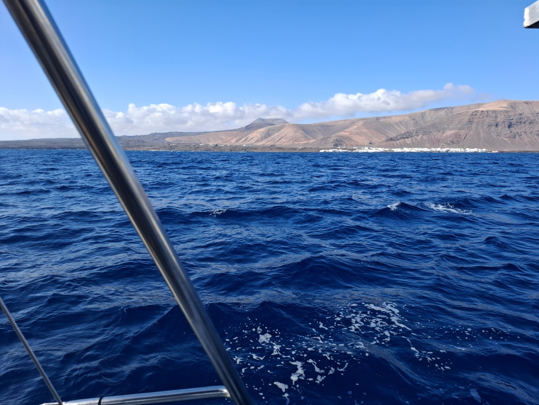 04 octobre : 09h15 : nous quittons le mouillage de Cala Francese, pour prendre le chenal qui sépare La Graciosa de Lanzarote, puis descendre le long de la côte sud-est de cette île, poussés par un bon vent portant. Le rivage qui défile est aride, ourlé par endroits de villages blancs.