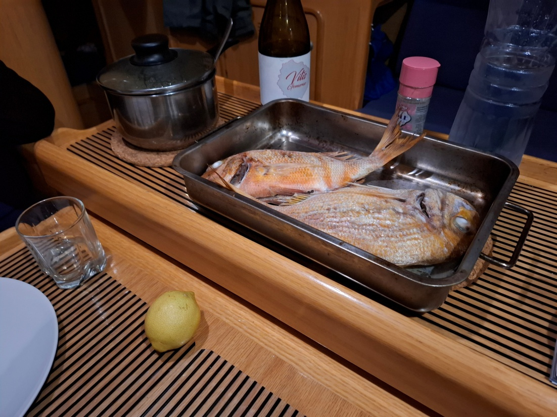 En échange d'une tablette de chocolat, ils nous offrent 4 magnifiques daurades!