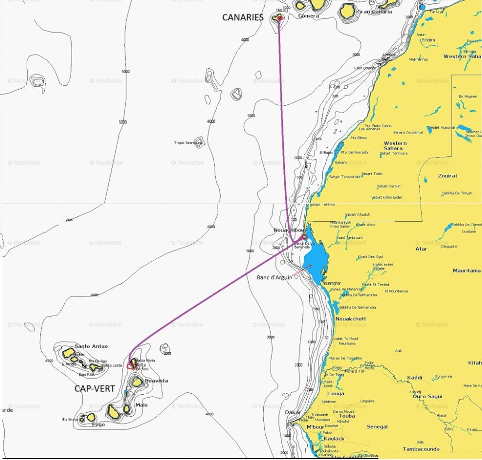 Le trajet direct des Canaries à l'archipel du Cap-Vert représenterait près de 6 jours de navigation. Nous préfèrerons le couper en 2 étapes, chacune de 3 jours, en faisant escale à Nouadhibou, en Mauritanie.